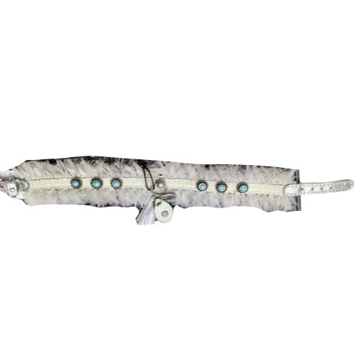 Su base resistente garantiza un ajuste seguro alrededor del cuello, mientras que el acabado con plumas suaves y voluminosas proporciona una sensación ligera y confortable, evitando roces o incomodidades. Los detalles metálicos y las incrustaciones turquesa refuerzan su estructura y aportan un estilo único que destaca en cualquier entorno.