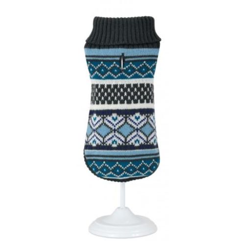 Un jersey de punto azul con estampado geométrico que mantiene a tu perro abrigado, cómodo y con mucho estilo en cada paseo. Perfecto para protegerlo del frío mientras luce moderno y adorable.